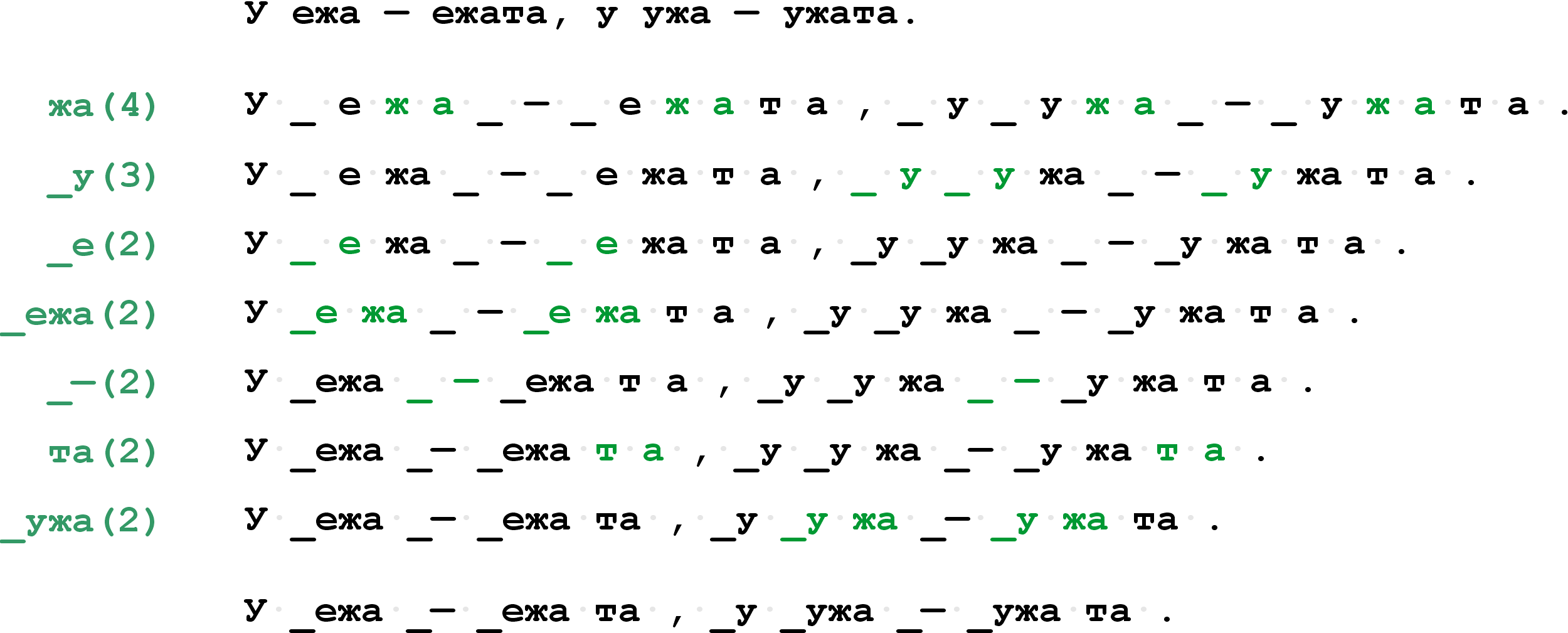 " Например, слово `lower` представляется как `l o w e r`.\n",
